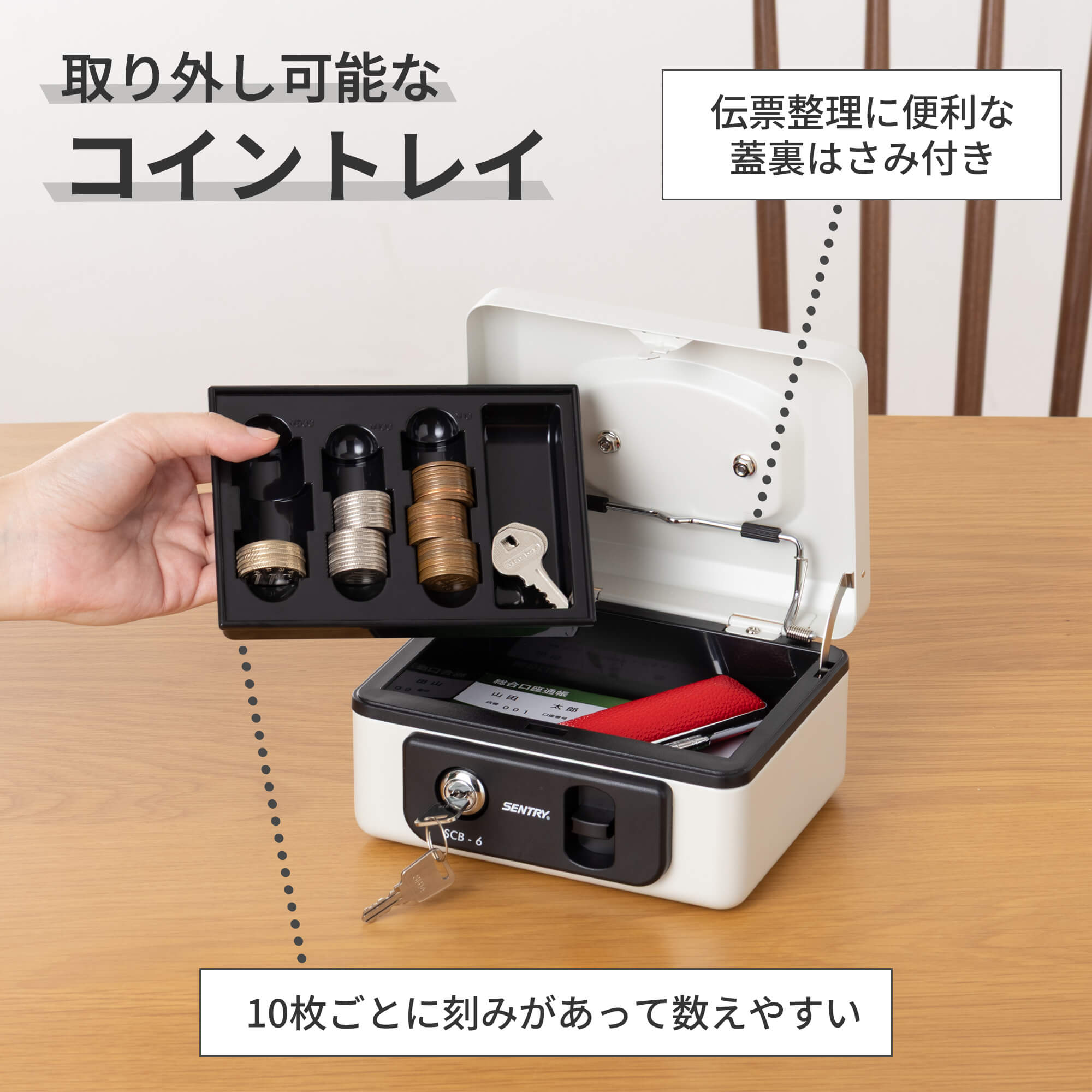 10枚ごとに刻みがついたコインカウンター付トレイ付で硬貨の整理に最適です。伝票整理に便利な書類はさみつき