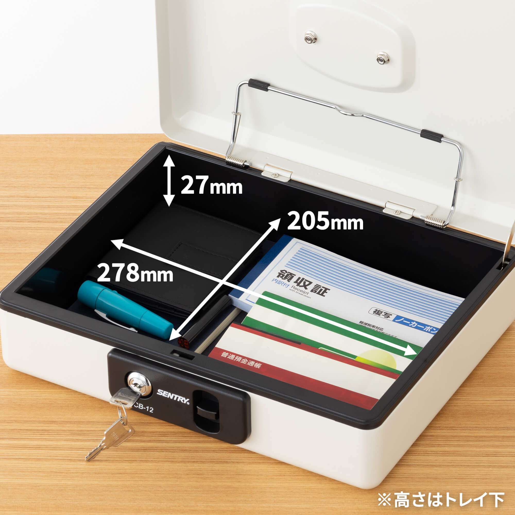 トレイの下はフリースペースとなっており、通帳や書類などの保管に最適です。