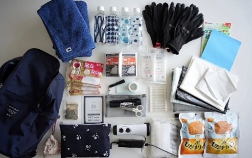 LEDライト/家族分の水/千円札と小銭/絆創膏/食料品/モバイルバッテリー/口腔ケア用品/カイロと冷却バック/除菌シート/ウェットティッシュ/緊急連絡先一覧表/衛生セット/文具セット/ケガ防止セット&防寒セット