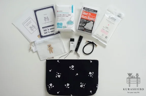 凝固剤のいらない携帯トイレ/静音アルミブランケット/アルコールウェットシート/防臭袋/ミニライト/ホイッスル/小銭(千円札、百円玉、十円玉) ※基本はキャッシュレスですが必ず持ち歩いています。/大切な人の連絡先一覧表/ ヘアゴム/ 絆創膏/リップクリーム/(必要であれば)常備薬