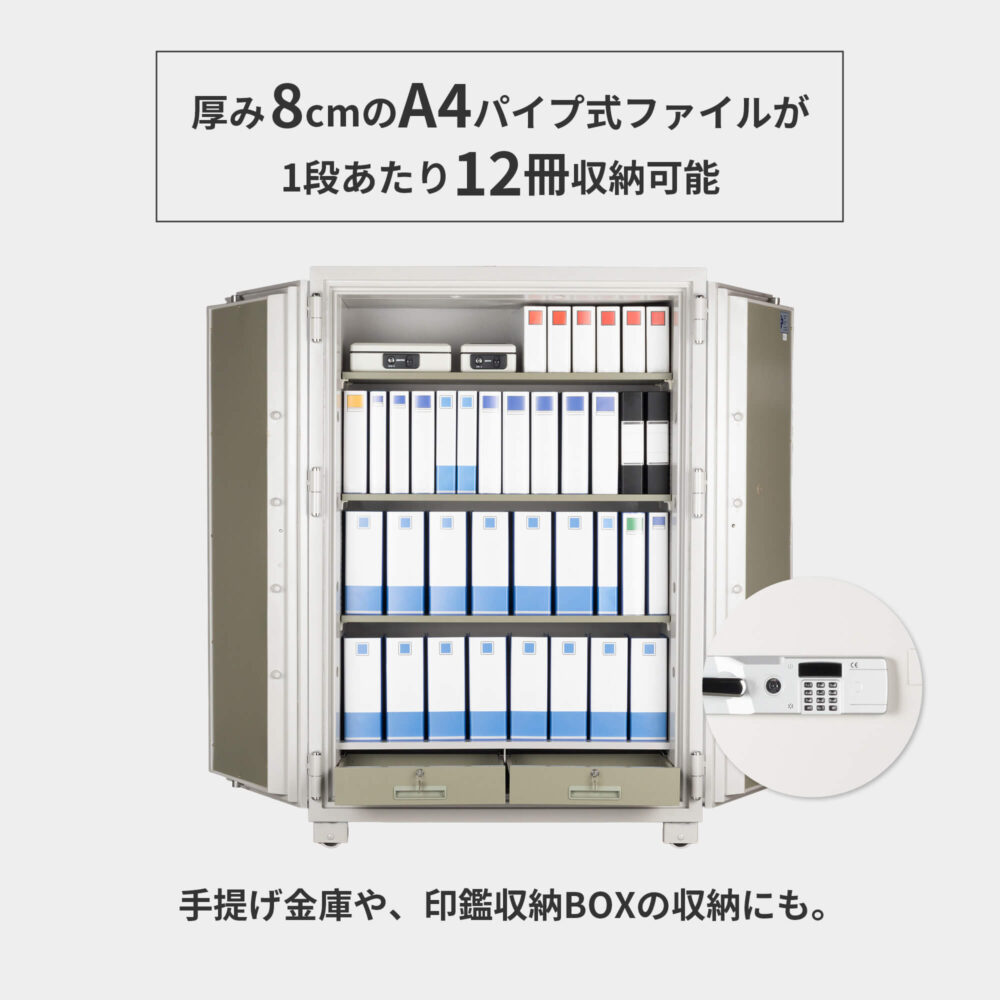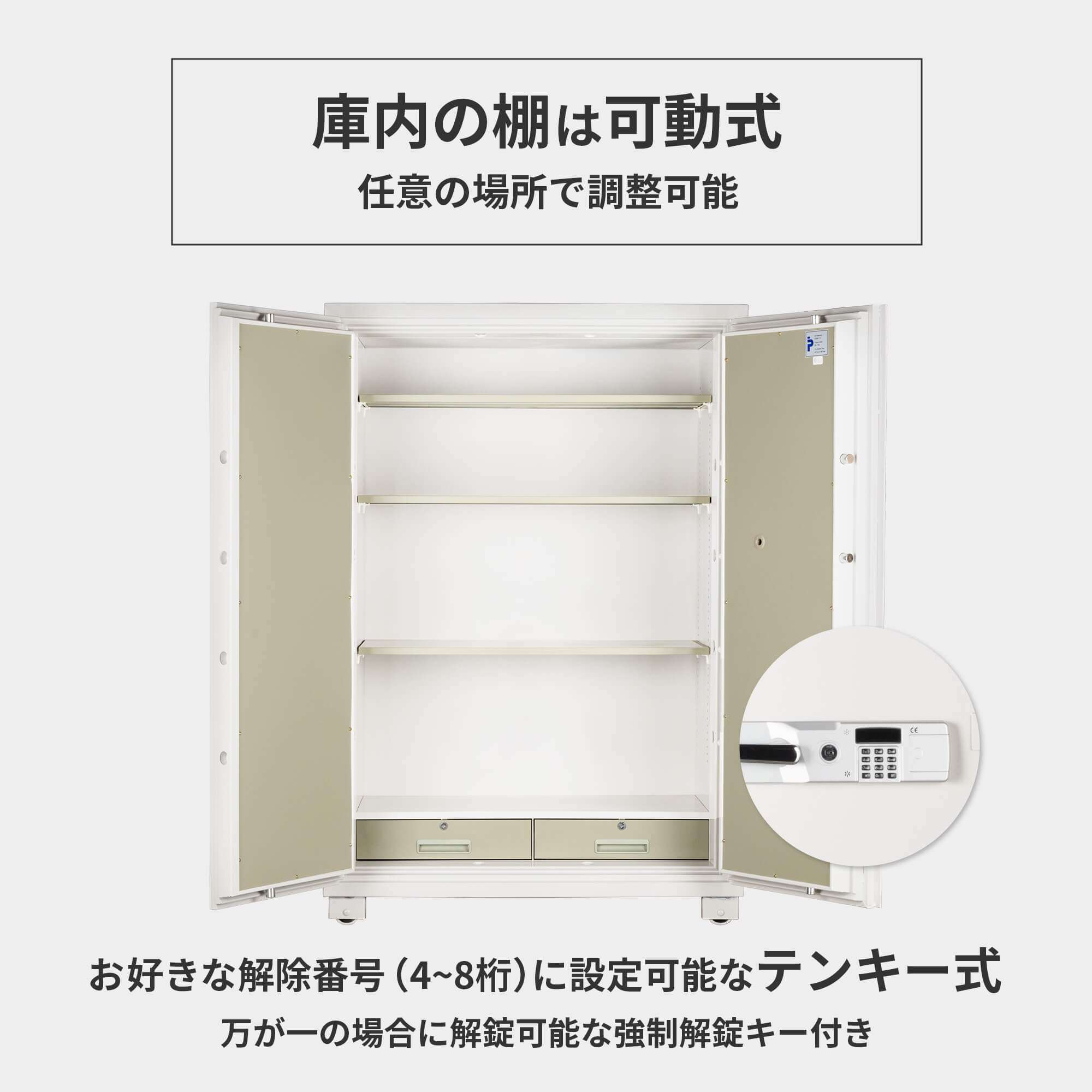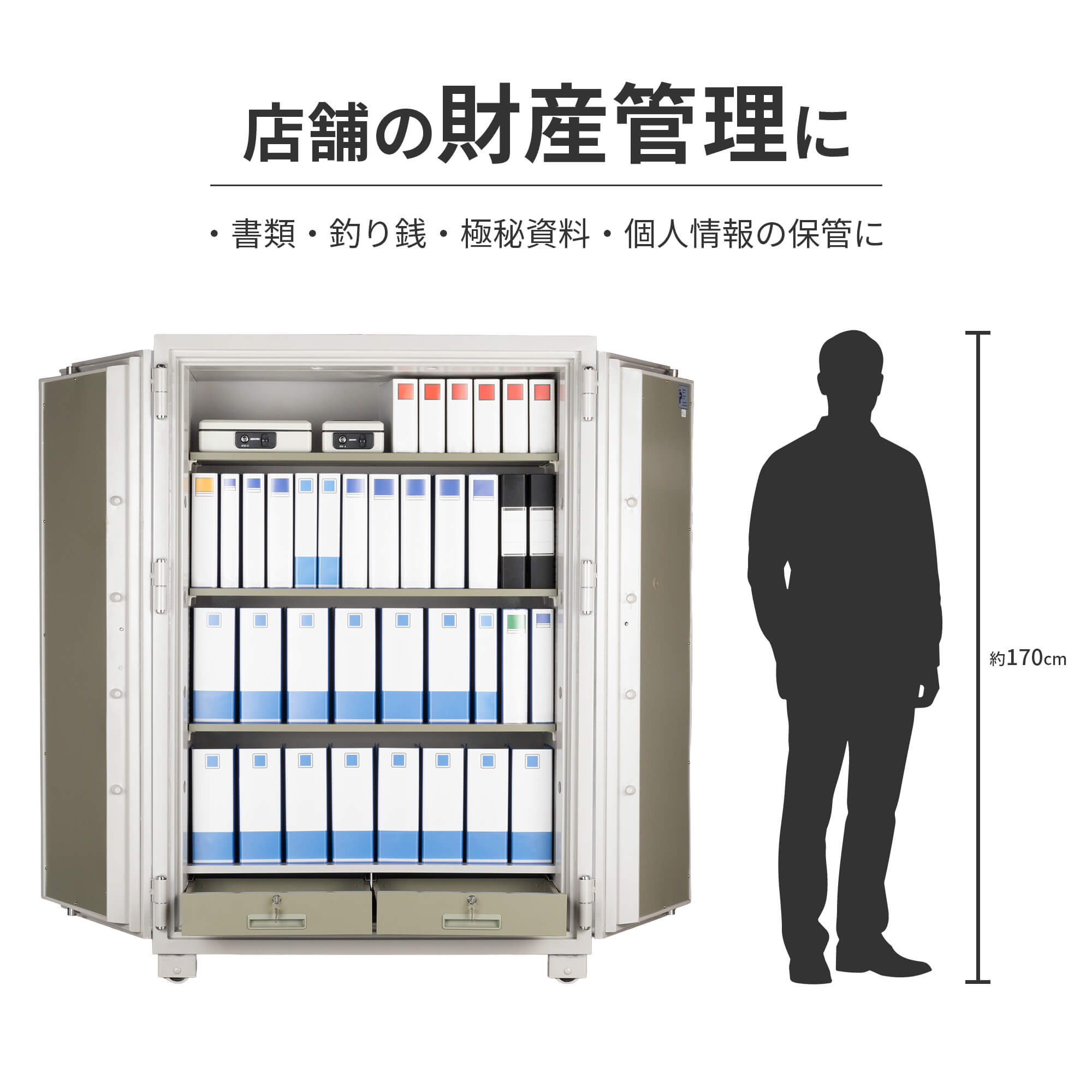 豊富なサイズバリエーションとロックタイプもテンキー式 / 設定変更可能ダイヤル式から選べる業務用金庫。JIS認定およびSP(スウェーデン国立技術研究所)認定製品。両開き扉で受注生産限定。