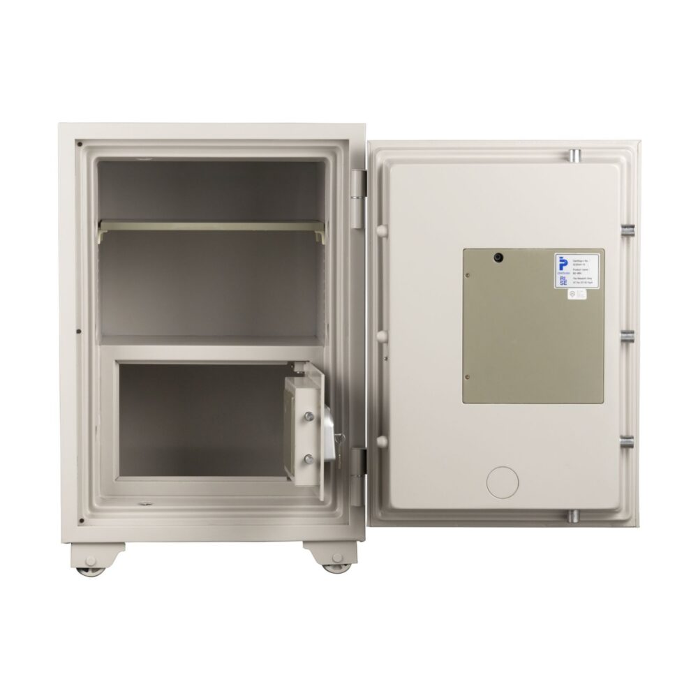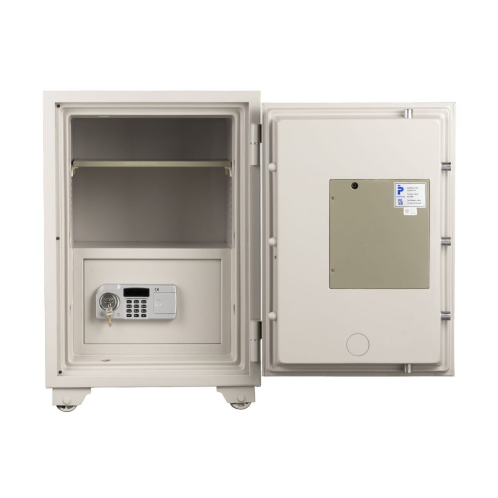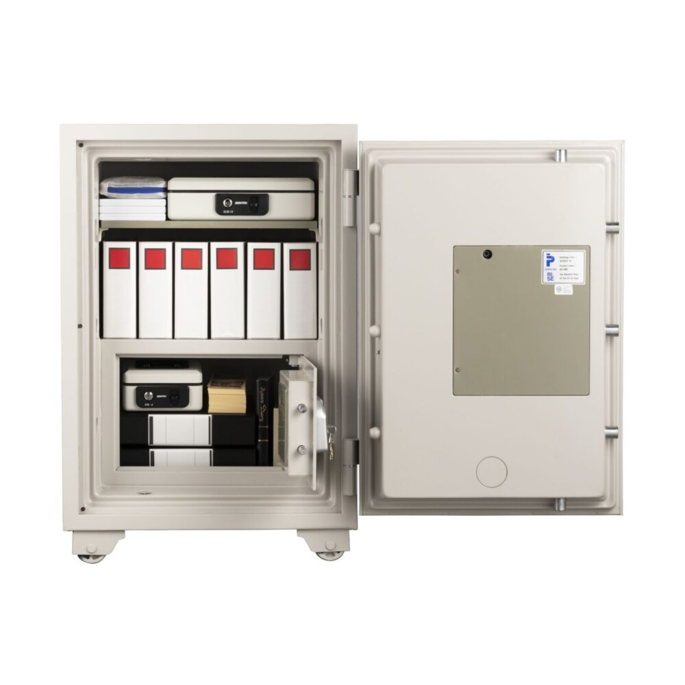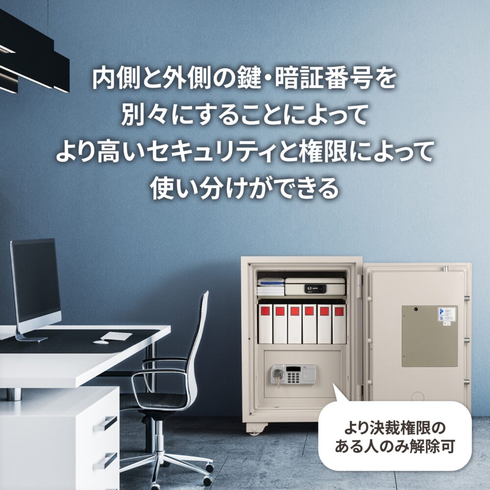 扉の内外に2つのテンキー式+シリンダー鍵のロック機能を備え、それぞれのテンキー式に別々の暗証番号を設定することでより高いセキュリティと権限によっての使い分けが可能な業務用耐火金庫。