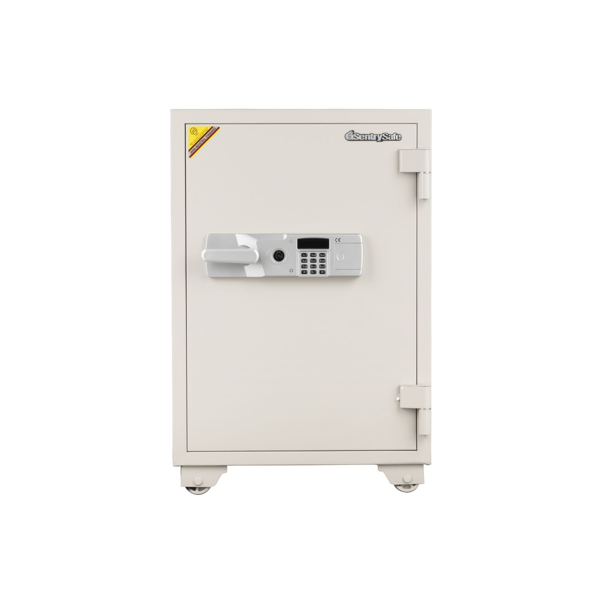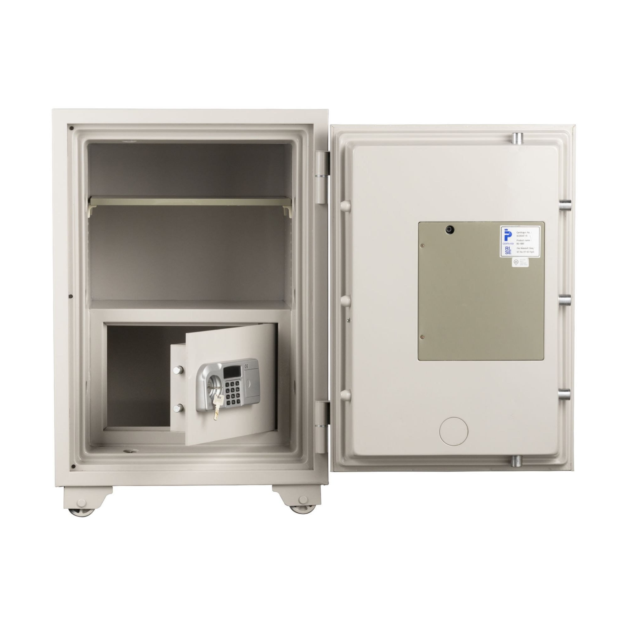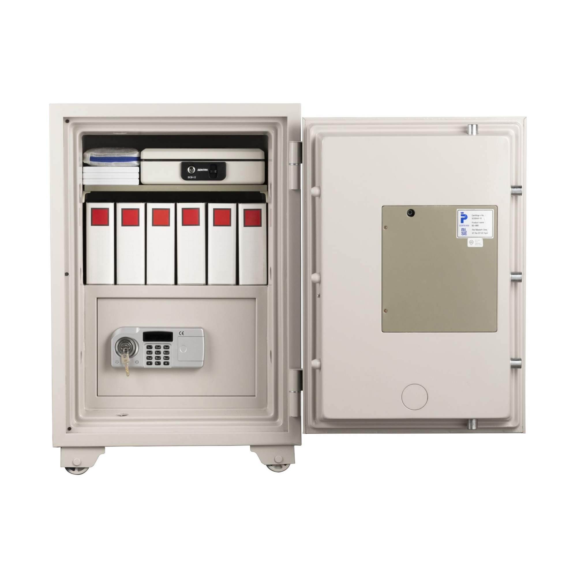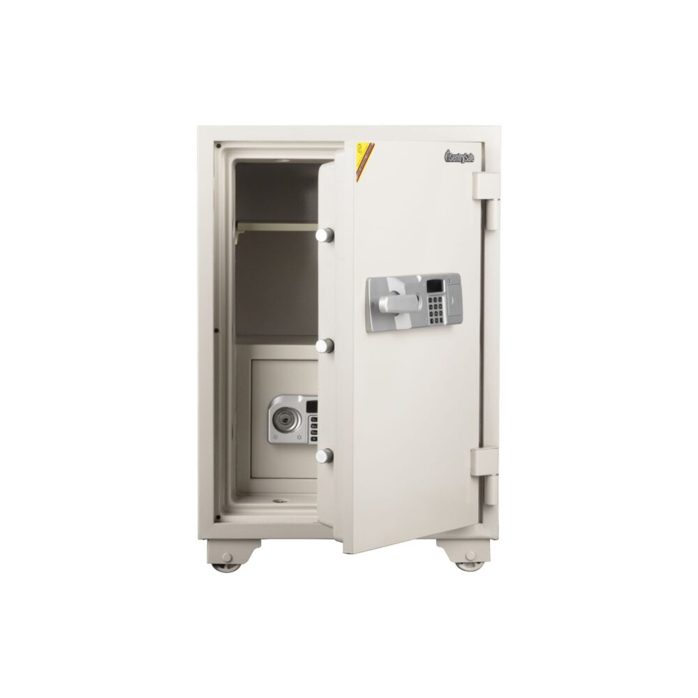 扉の内外に2つのテンキー式+シリンダー鍵のロック機能を備え、それぞれのテンキー式に別々の暗証番号を設定することでより高いセキュリティと権限によっての使い分けが可能な業務用耐火金庫。