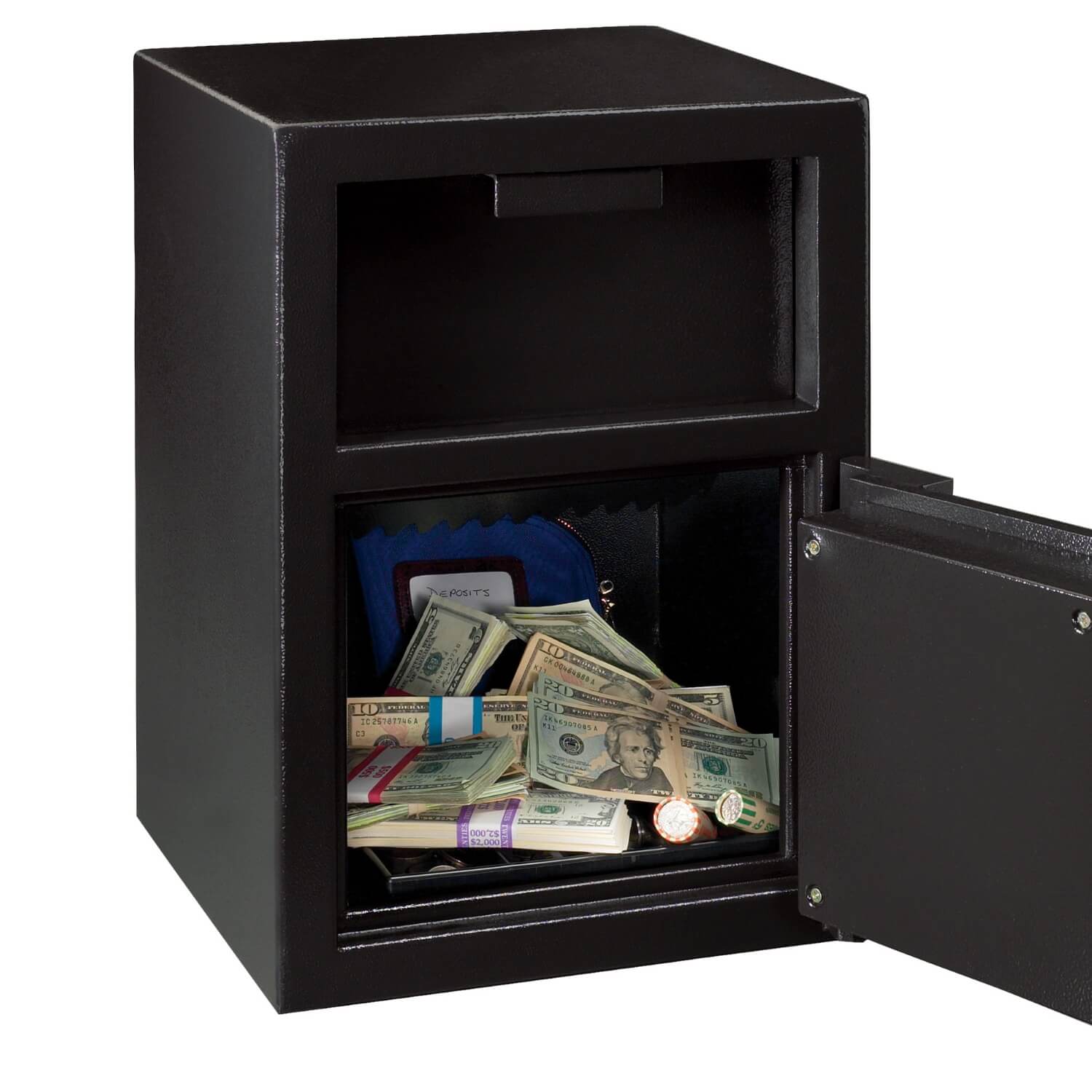 コンビニエンスストアー・バー・レストラン・ガソリンスタンドなどの、夜間営業や人の出入りが多い小売店のセキュリティ対策に最適な投入式金庫。現金・レシートなどを上の投入口から入れるだけで下のスペースに落ち、分厚い鋼鉄のボディが外部から収納物を守ります!お好みの暗証番号を7つまで登録可能なため、複数人での使用にも対応できます。
