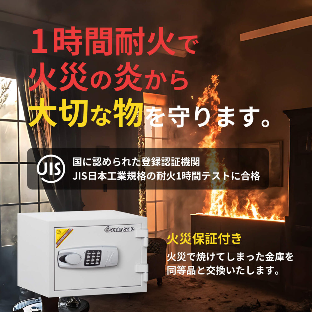JIS規格の耐火1時間テストに合格。国に認められた登録認証機関によりJISマークの表示を認められているJIS認証製品です。