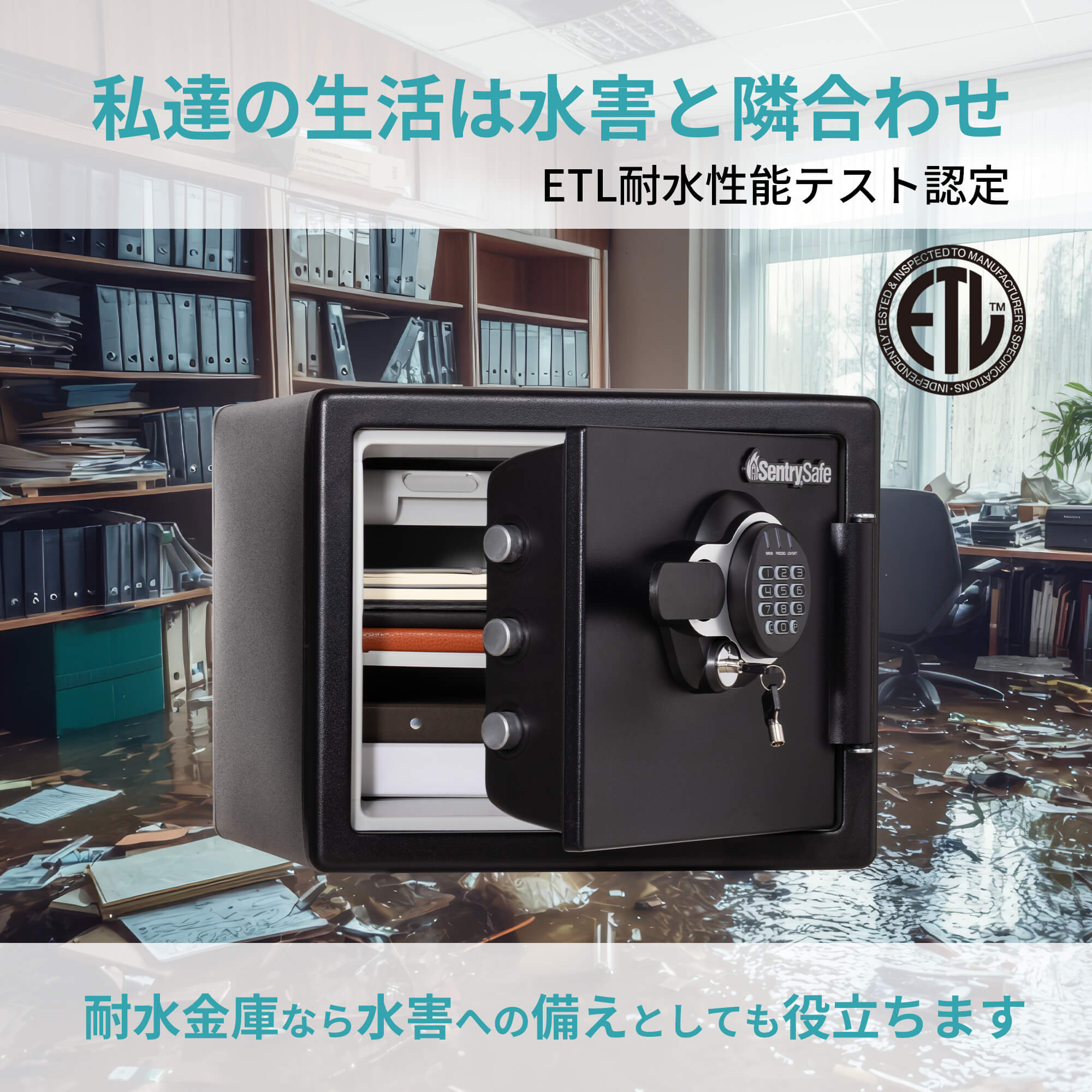 火災時の消火放水や、豪雨や台風などの水害による浸水に対して、庫内に水が入らないことが検証・認定されています(下底部より20cm未満の浸水に対し内部に水を入れない仕様)。