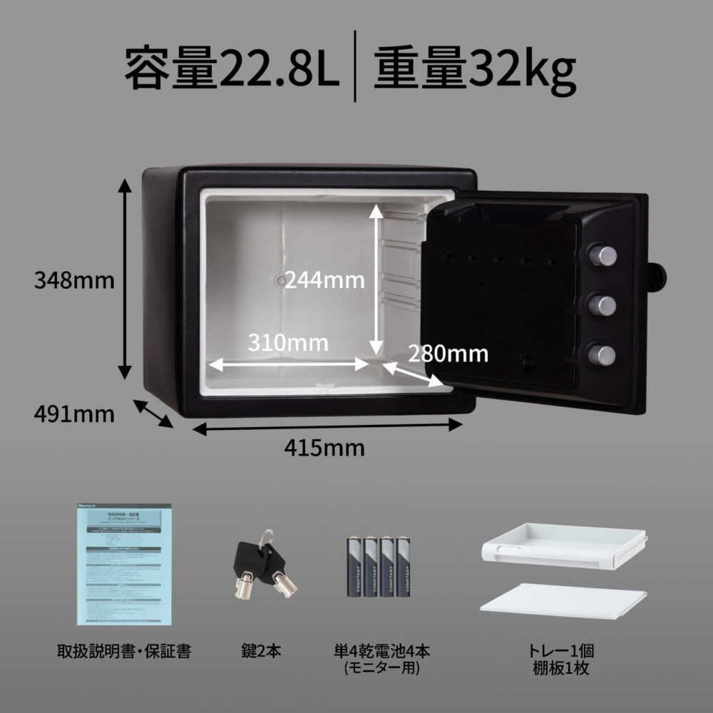 | 付属品 | 鍵2本、トレイ1個、棚板1枚、単4乾電池4本(モニター用)、取扱説明書・保証書 |