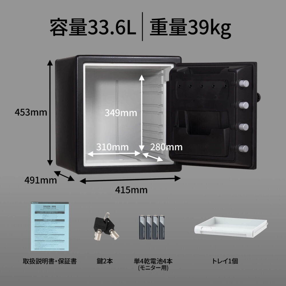 | 付属品 | 鍵2本、トレイ1個、取扱説明書・保証書、単4乾電池4本(モニター用) |
