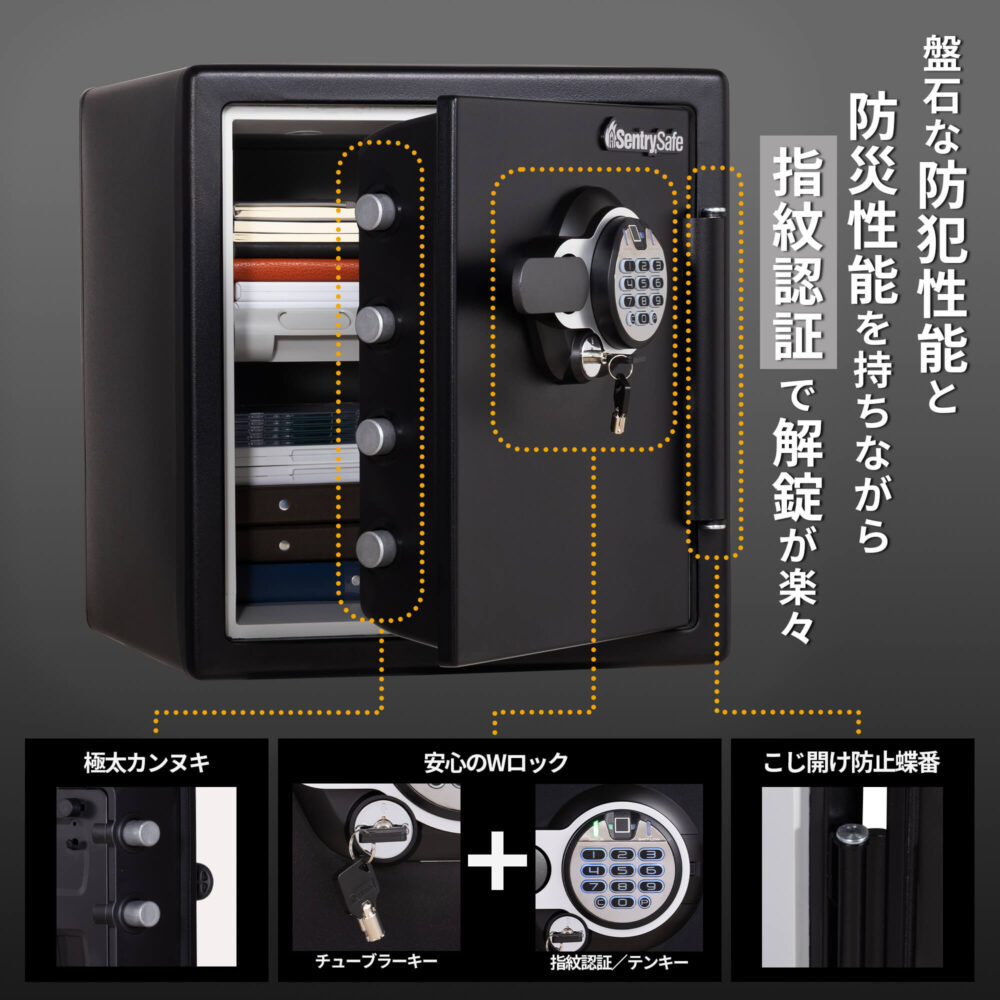 太いカンヌキや、扉こじ開けに強い蝶番などのハイセキュリティ仕様とあわせ、いっそう心強い金庫です。