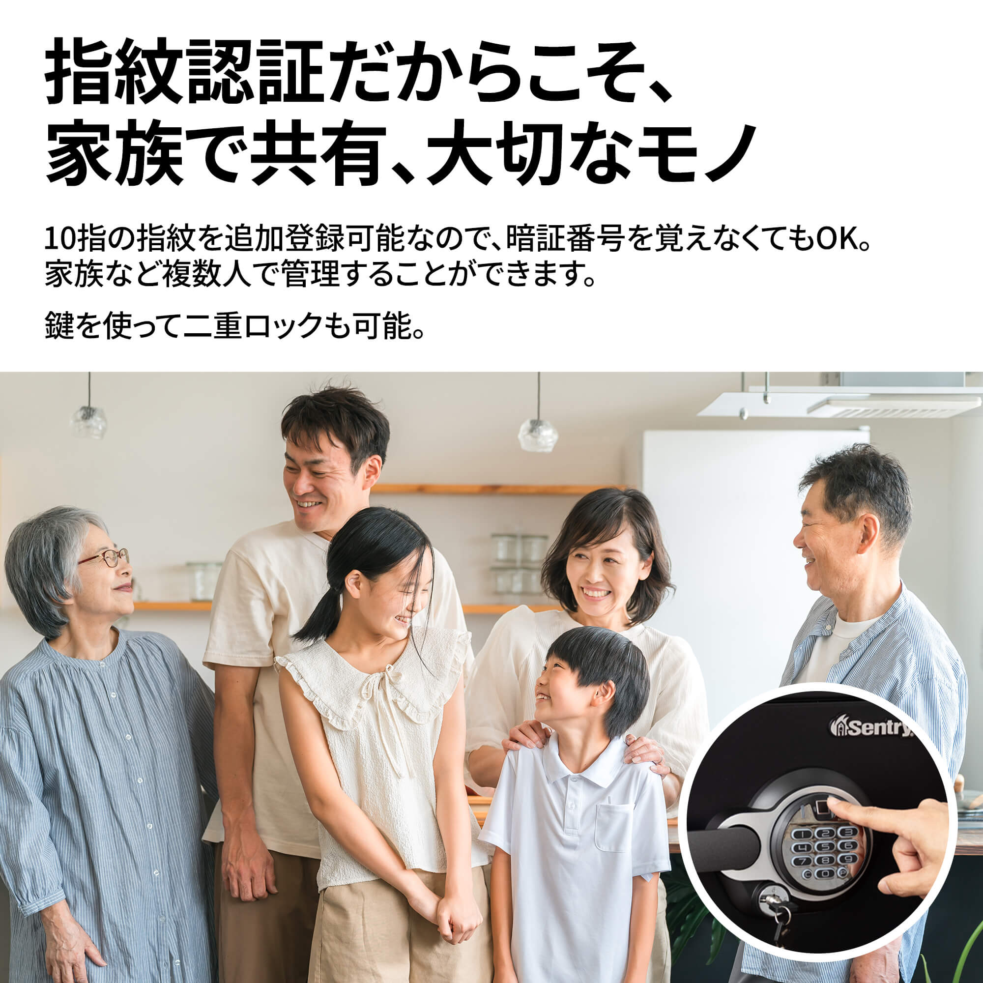 暗証番号を使った指紋登録により、登録した指をセンサーに置くだけで簡単に解錠。暗証番号と指紋認証のお好みの方法で開けられます。
