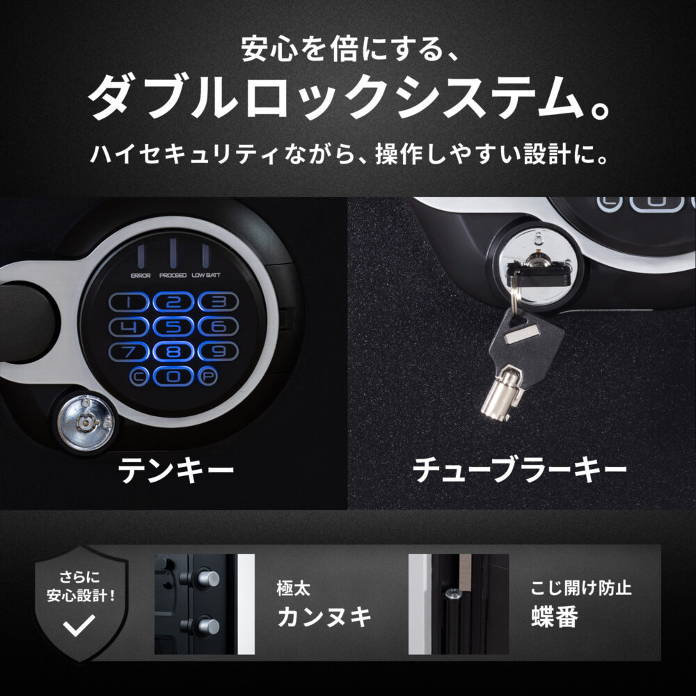 大きく見やすい数字キーで快適に操作でき、暗いところでも視認性が高いバックライト付テンキーを採用。お好みの数字で2つの暗証番号を追加登録することが可能です。さらに複製しにくいチューブラーキー(円筒形シリンダー錠)によりダブルロックができます。